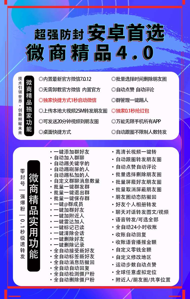 微商精品安卓高端全能营销转发软件,顶尖团队技术打造,原包原码,永久免费更新,不卡頻,不闪退,内测一键群发5000好友,万群同步讲师必备,分批拉群,一键秒刷朋友圈大视频,微商必备,首选微商精品!